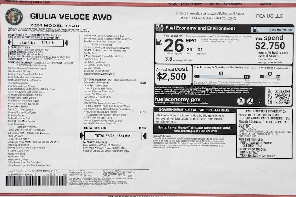 Navigation, All Wheel Drive, Heated Driver Seat, Heated Rear Seat, Back-Up Camera, Turbocharged, Satellite Radio, iPod/MP3 Input, Bluetooth®, Dual Moonroof. MP3 Player, Keyless Entry, Steering Wheel Controls, Child Safety Locks. Alfa Romeo Veloce with Alfa White exterior and Black interior features a 4 Cylinder Engine with 280 HP at 5200 RPM*. AutoCheck One Owner Was $54,535.