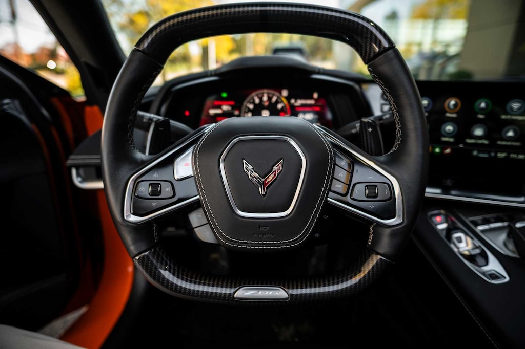 Leather Seats, Heated Driver Seat, Cooled Driver Seat, Back-Up Camera, Premium Sound System, Satellite Radio, Onboard Communications System, Targa Roof, Remote Engine Start, Dual Zone A/C. Rear Spoiler, Keyless Entry, Remote Trunk Release, Electronic Stability Control. Chevrolet 3LZ with Amplify Orange Tintcoat exterior and Jet Black interior features a 8 Cylinder Engine with 670 HP at 8400 RPM*. This Corvette is priced $11,900 below J.D. Power Retail. Reduced from $124,998.